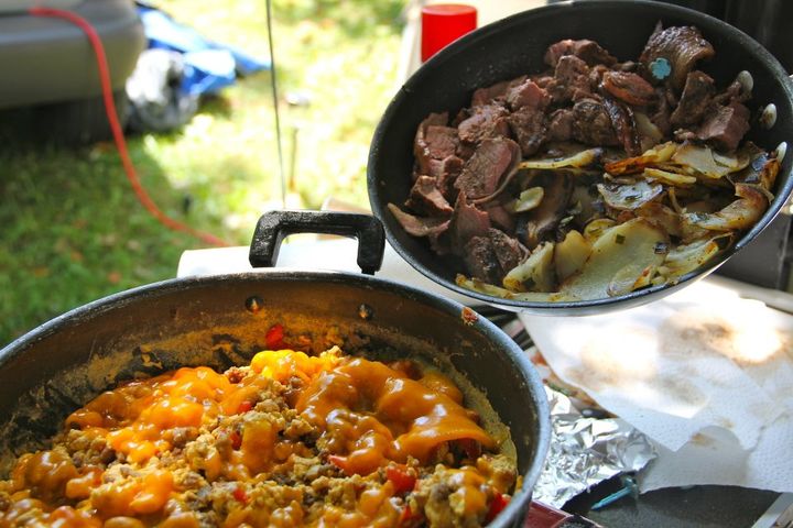 One of our many delicious in-camp meals! Breakfast: Sliced Bacon-wrapped Filet Mignon with Potatoes, Scrambled Eggs w/ Red Peppers and Cheese. Tortillas and salsa not shown!
