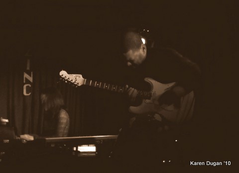 I take a seat in the front so I could ATTEMPT to capture pictures with my camera phone, yes, my camera phone. Oh the horror….I am disgusted at my forgetfulness. Especially, as I turned in my seat and saw Jeffery’s cheetah print guitar case that I so desperately wanted a picture of! Jeffery comes over and places his glasses on my table, “These are prescription,” and with that he takes to the stage with Richie Good and Nuclear Fusion.