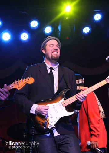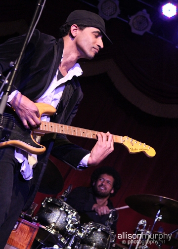 A little after 9pm, The Nigel Hall Band, consisting of Eric Krasno on bass, Adam Deitch on drums, Neal Evans on organ, Alan Evans on percussion, Mel Flannery and Tania Jones on backup vocals and Adam “Shmeeans” Smirnoff on guitar, hit the stage filling the excessively packed venue with soulful songs layered with get-down funk. It’s always awesome seeing Krasno on bass. He is so smooth with his guitar and to see him with a bass while others fill the guitar spot, well, it’s fun! The always soulful Hall, decked out in an orange and white argyle sweater and a baseball cap, geared us up in a way that only he could. While most songs were sung seated at his Rhodes, Hall sang his way through fan favorites such as “Never Know” and “Gimmie A Sign.”